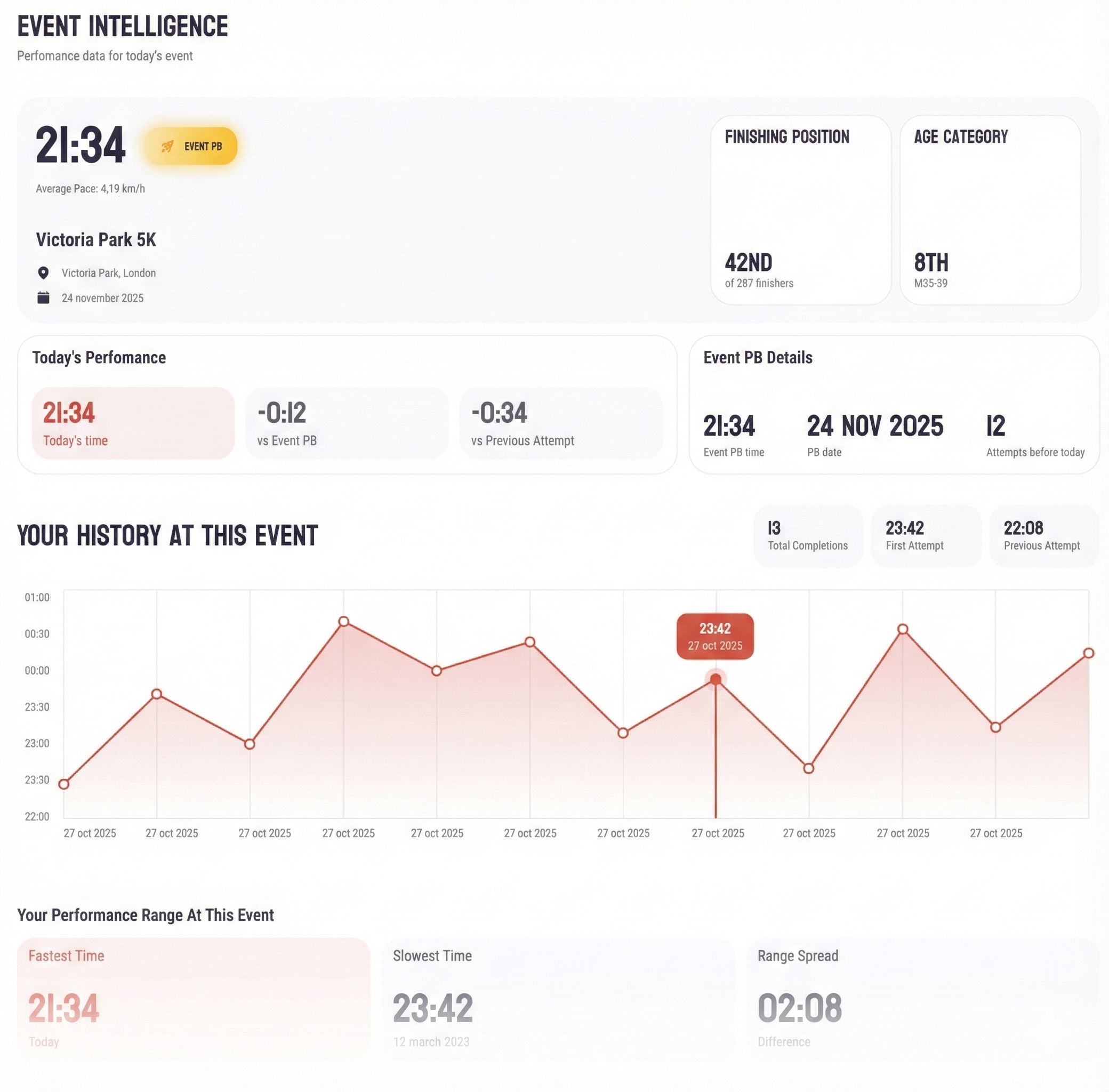 Your series dashboard transforms repeated runs into meaningful insight. Track progress across attempts, spot patterns in performance, consistency, and pacing, and understand how today compares to your history. It is not just results, it is context for how far you have come.